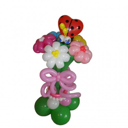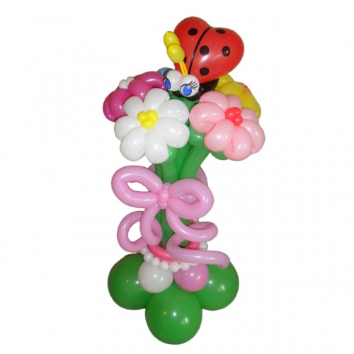 Ця яскрава композиція з повітряних кульок стане чудовим доповненням для привітання з Днем народження або іншим святом! Букет складається з п’яти різнокольорових ромашок з повітряних кульок ШДМ, божої корівки (букашки) та стильної підставки з бусами і бантом.