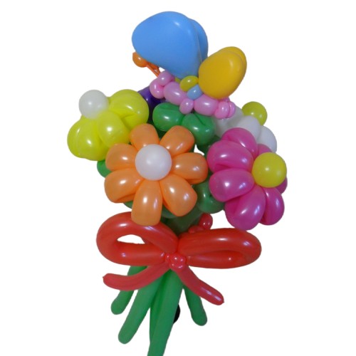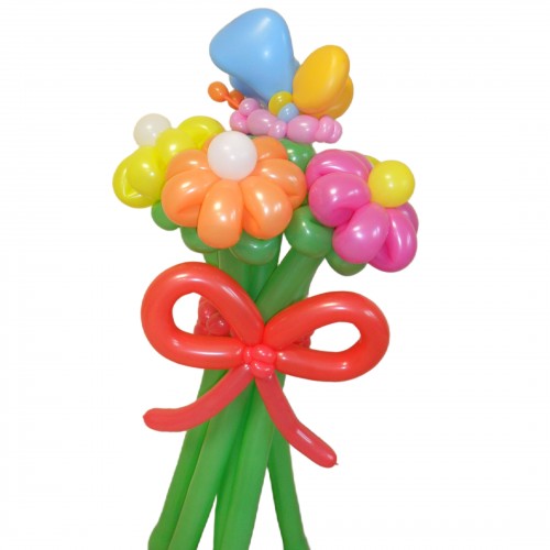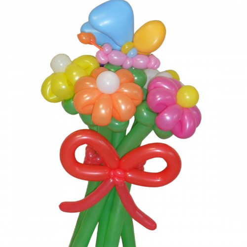 Цей яскравий букет з повітряних кульок стане чудовим доповненням до вашого свята! Композиція складається з 5 ромашок, виконаних з латексних кульок для моделювання (КДМ), а також красивої метелика та декоративного банта.