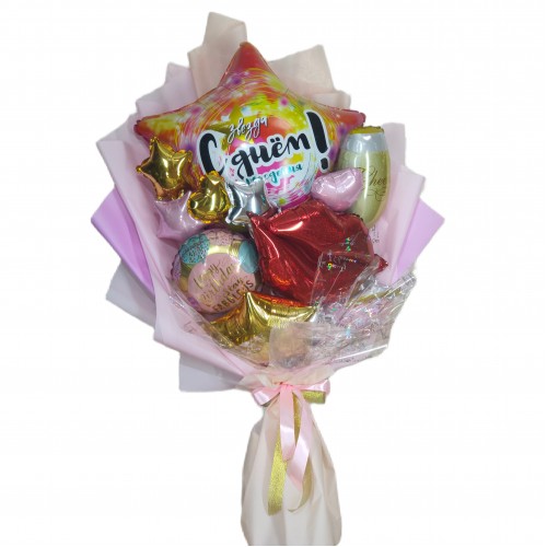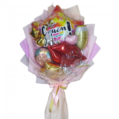 Представляємо вам авторський букет із кульок "Губки і Бокал"! Цей яскравий та кольоровий крафтовий букет з фольгованих куль стане чудовим подарунком для святкування особливих моментів, додаючи атмосферу свята та радості.