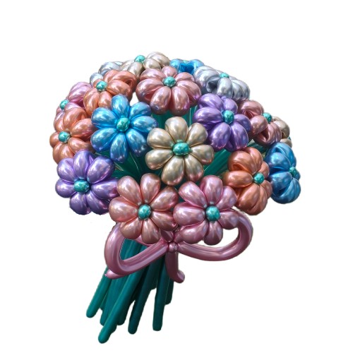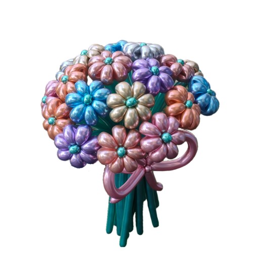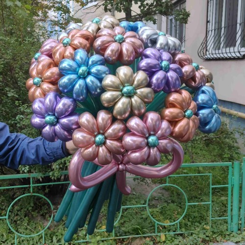 - Композиція: 21 ромашка з кульок Хром + бантик з кульок + біжутерія.