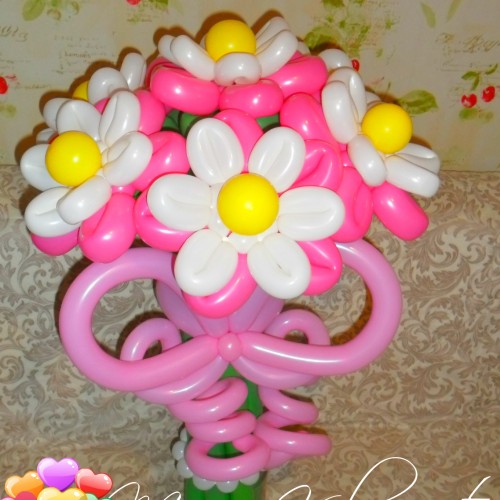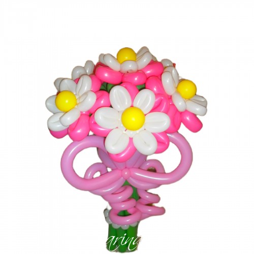 Ця чудова композиція з повітряних кульок обов'язково приверне увагу! Букет складається з семи подвійних ромашок, виконаних у ніжних рожевих і білих кольорах, та елегантного банта з повітряних шариків.