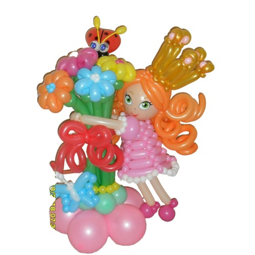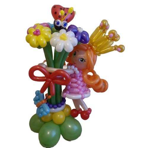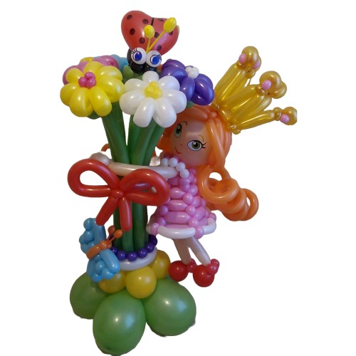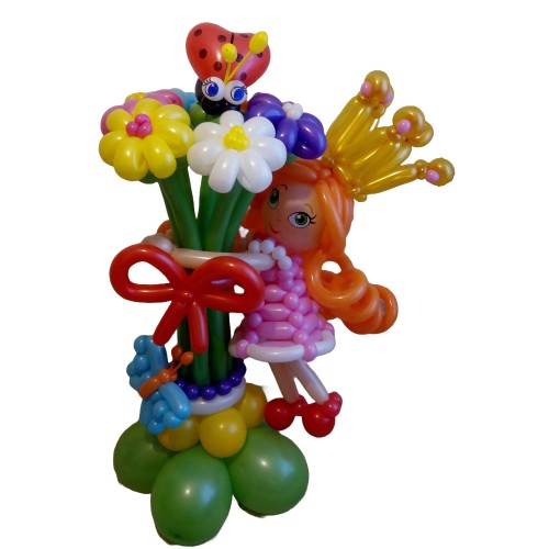 Ця чудова композиція із кульок стане яскравим подарунком для маленької принцеси чи підлітка! Букет складається з семи ромашок, божої корівки, метелика, банта, бус та плетеної фігурки дівчинки з повітряних кульок.