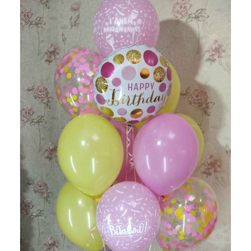 - Дві гелієві кульки з конфетті 14" — додають святкового ефекту, наповнюючи атмосферу радісним настроєм.