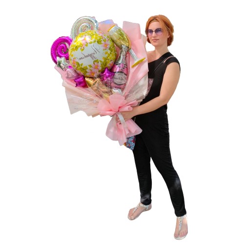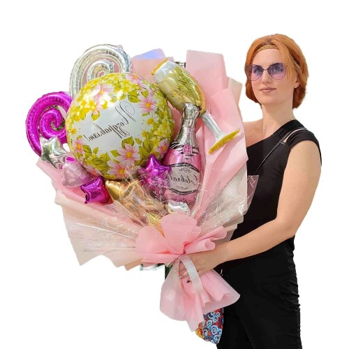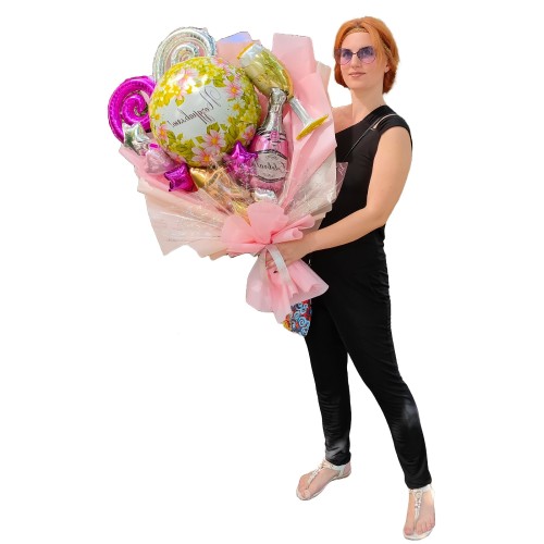 Додаткові можливості: Не забувайте, що можна доповнити цей букет іншими елементами, такими як гелієві кульки або букет з шарів, щоб зробити свято ще більш ефектним.