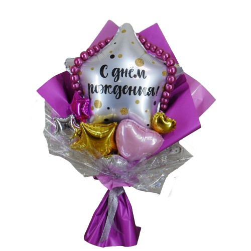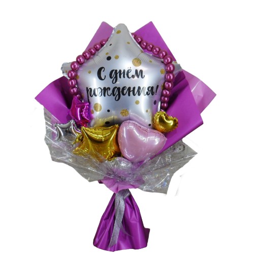 Букет складається з фольгованих кульок, надутих повітрям, які зберігають свою форму протягом кількох місяців. Він пакується в крафтову папір та плівку, а також прикрашається елегантними атласними стрічками, що додає йому неповторної елегантності.