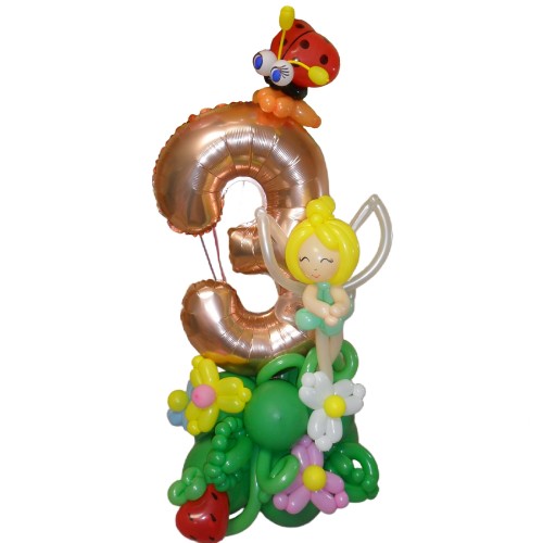 Ця композиція з повітряних кульок стане чудовим подарунком до Дня народження для маленької дівчинки чи підлітка. Унікальний дизайн включає фольговану цифру "3" на підставці, прикрашену кольоровими квітами з кульок, фігуру Динь-Динь, а також фонтан гелієвих кульок, який створює неймовірно святкову атмосферу.
