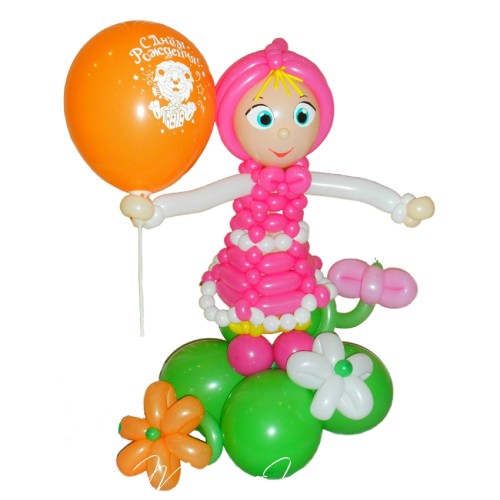 Маша з кульок — це справжній герой мультфільму "Маша і Ведмідь", яку люблять всі діти. Вона завжди радує своєю енергійністю і веселим настроєм. До цієї композиції можна додати додаткові елементи, наприклад, гелієві кульки, щоб створити ще більш святкову атмосферу.
