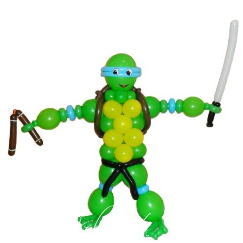 Ніндзя Черепашка з кульок — чудовий вибір для фанатів мультфільму Черепашки Ніндзя! Фігура героя Черепашок Ніндзя виготовлена з повітряних кульок та розташована на стійкій підставці. Висота фігури Черепашки Ніндзя — 130 см, ширина — 40 см. Ця безкаркасна іграшка не може стояти на вітрі, тому для більшої стійкості рекомендується використовувати її в приміщенні або на захищених від вітру територіях.