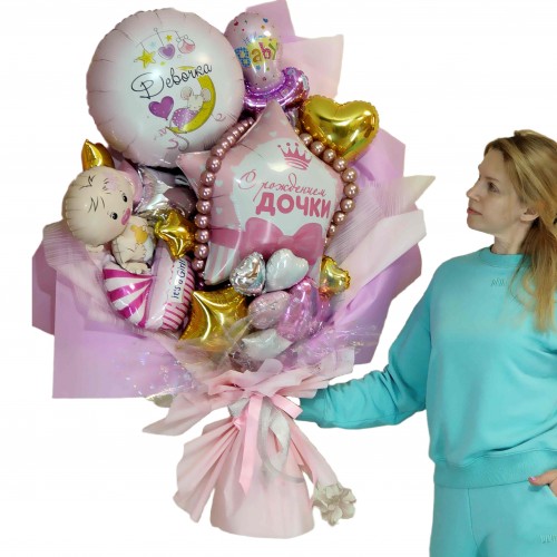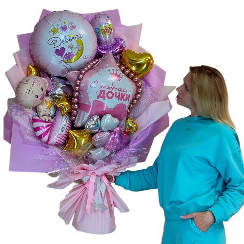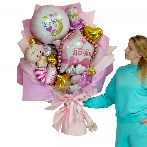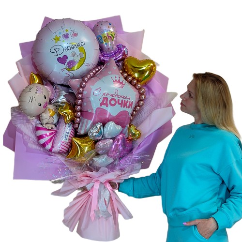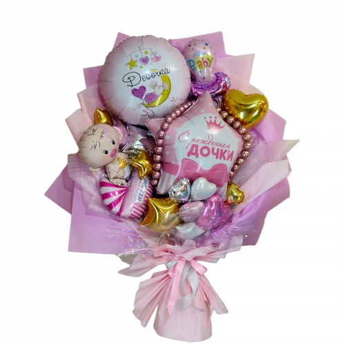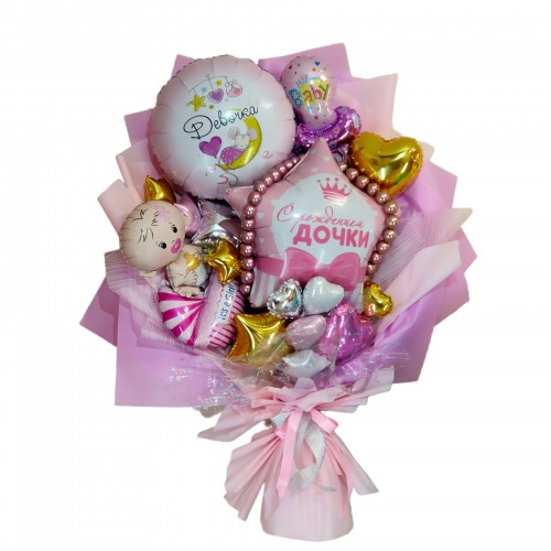 Подходит для: Этот букет идеально подходит для выписки из роддома, подарка для любимой доченьки, внучки или жены. Он станет ярким акцентом торжества и подарит незабываемые эмоции.