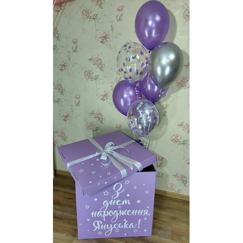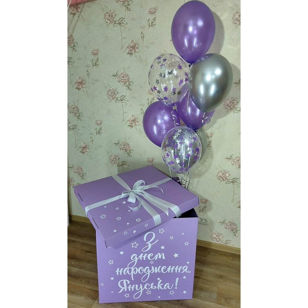 Коробка сюрприз ФіолетоваКоробка-сюрприз із гелієвими кульками — це ідеальний сюрприз для будь-якої ..
