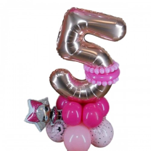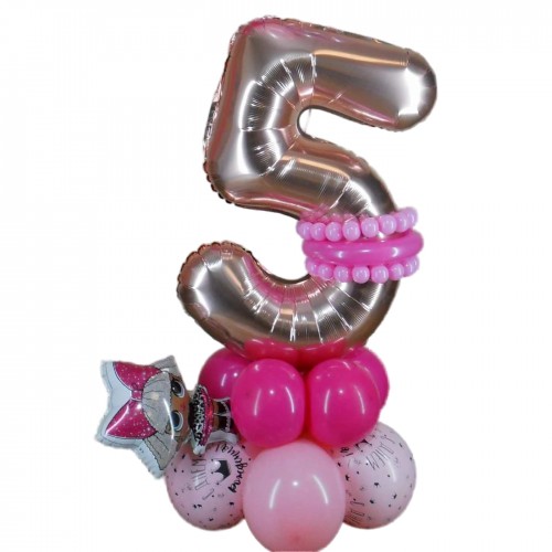 Ця чудова композиція з повітряних кульок у вигляді цифри "5" стане яскравим акцентом на святкуванні п'ятирічного ювілею вашої дитини. Створена з великою увагою до деталей, вона забезпечить незабутнє враження та святкову атмосферу. Цифра оформлена на стильній підставці з повітряних кульок та доповнена фольгованим шариком Лол.