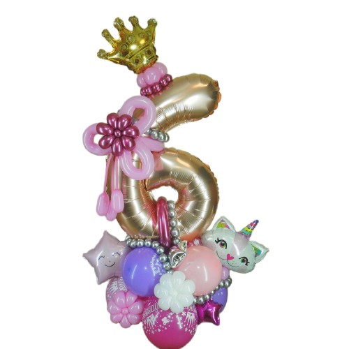 - Фольгована цифра 6, оформлена на підставці з повітряних кульок, додає святкової атмосфери та елегантності.