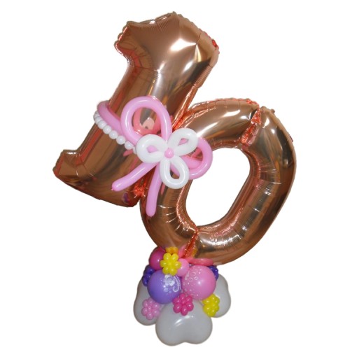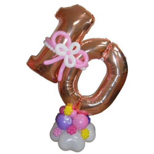 - Цифра 10 на підставці, прикрашена яскравими квітами з кульок, що додають святковості та незабутнього вигляду.