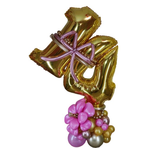 - Фольгована цифра 14 — вражаюча цифра з фольги, оформлена фольгованими кульками на підставці у вигляді різнокаліберної гирлянди. Це ідеальна цифра на свято, що додає урочистості вашому святкуванню.