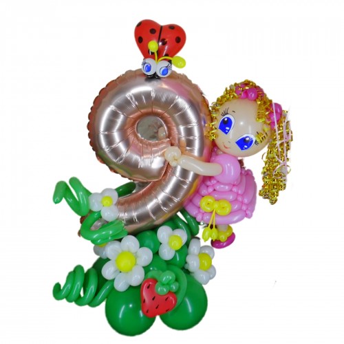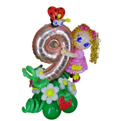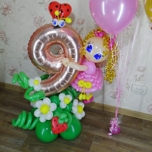 - Фольговану цифру 9 на підставці, оздоблену яскравими кольоровими квіточками з повітряних кульок, що створює атмосферу свята і чарівності. Цифри з повітряних кульок завжди додають святкового вигляду та ефектно підкреслюють важливість події.