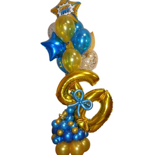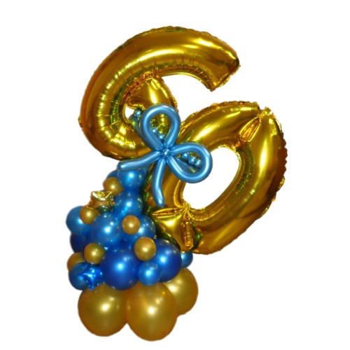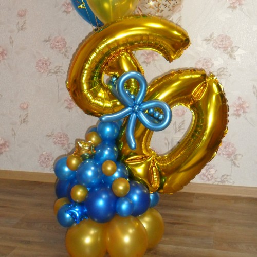 - Фольгована цифра 60 на підставці у вигляді різнокаліберної гірлянди з повітряних кульок.