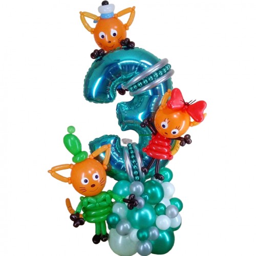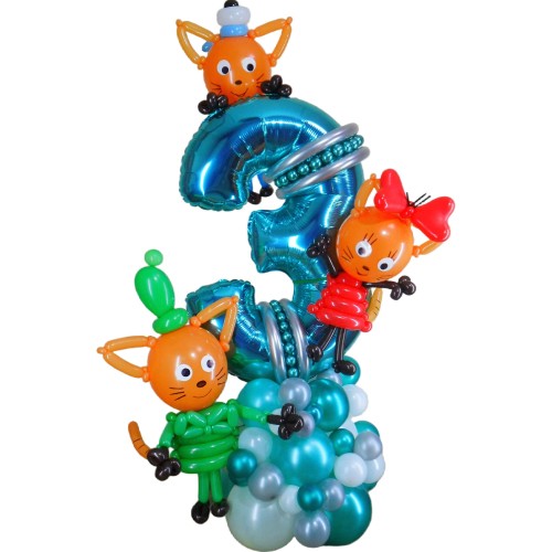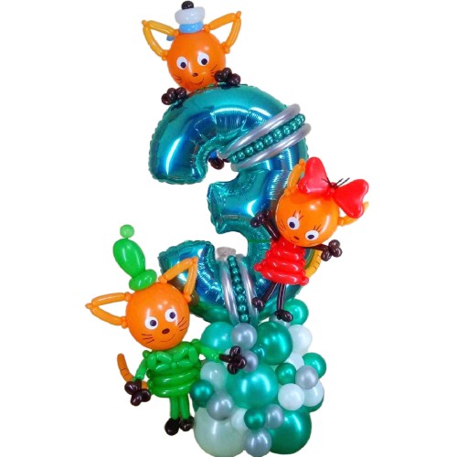 Привітайте малюка з Днем народження оригінальним та яскравим оформленням у стилі улюблених героїв мультфільму "Три кота"! Ця композиція з повітряних кульок стане яскравою прикрасою свята та принесе море радості дитині та гостям.