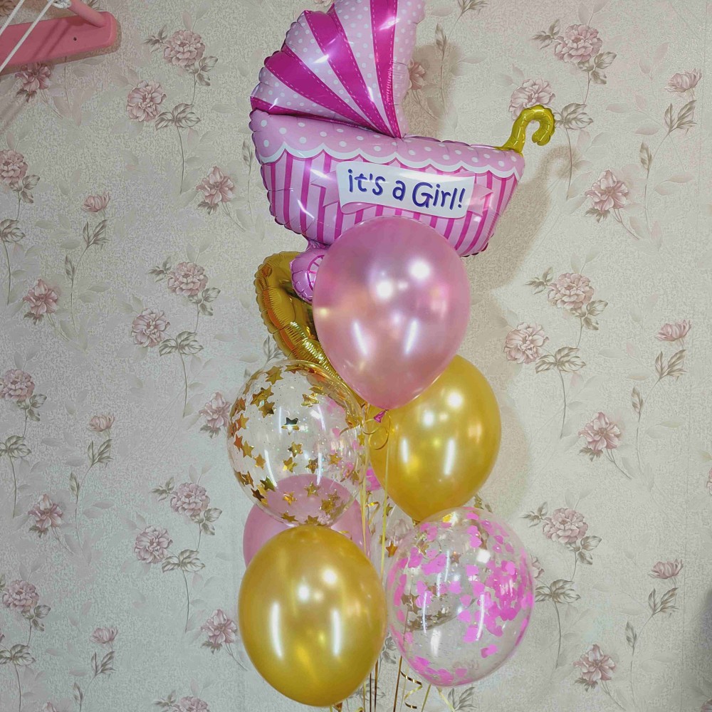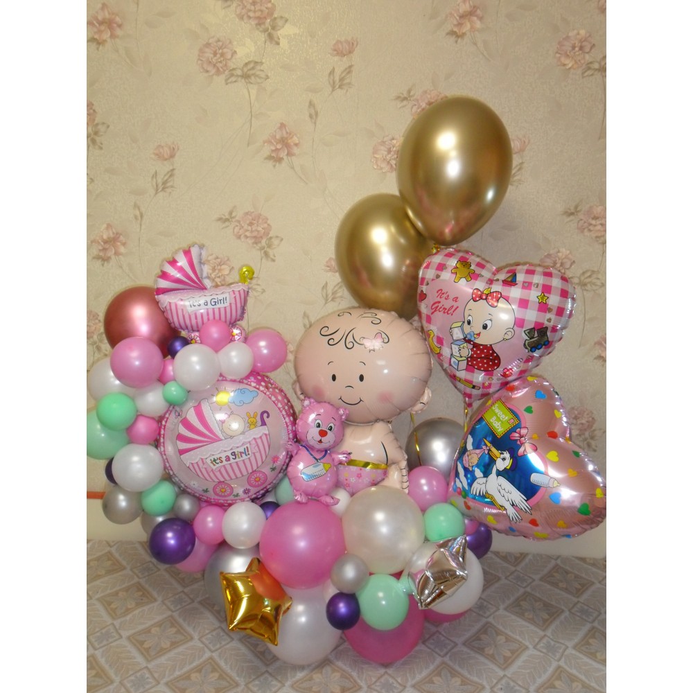 Кульки на виписку з пологового будинку для дівчинкиФонтан гелієвих кульок для виписки з пологового б..